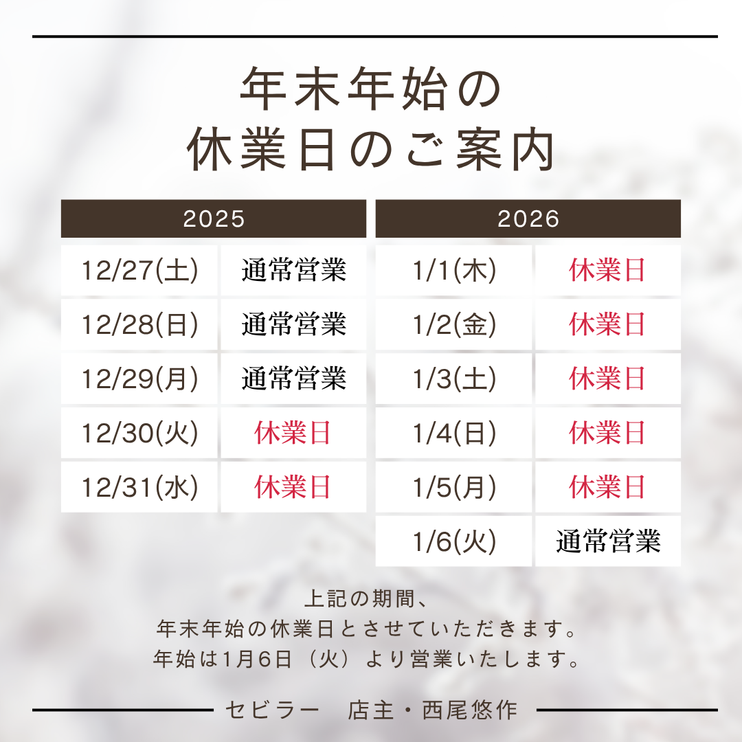 年末年始の営業のご案内をさせていただきます。年末は12/29日(月)まで営業し、年始は1/6日(火)から営業いたします。12/30日(火)~1/5日(月)までお休みを頂きます。